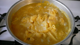 | Eggs cooking on a lightweight aluminum backpacking type pan |